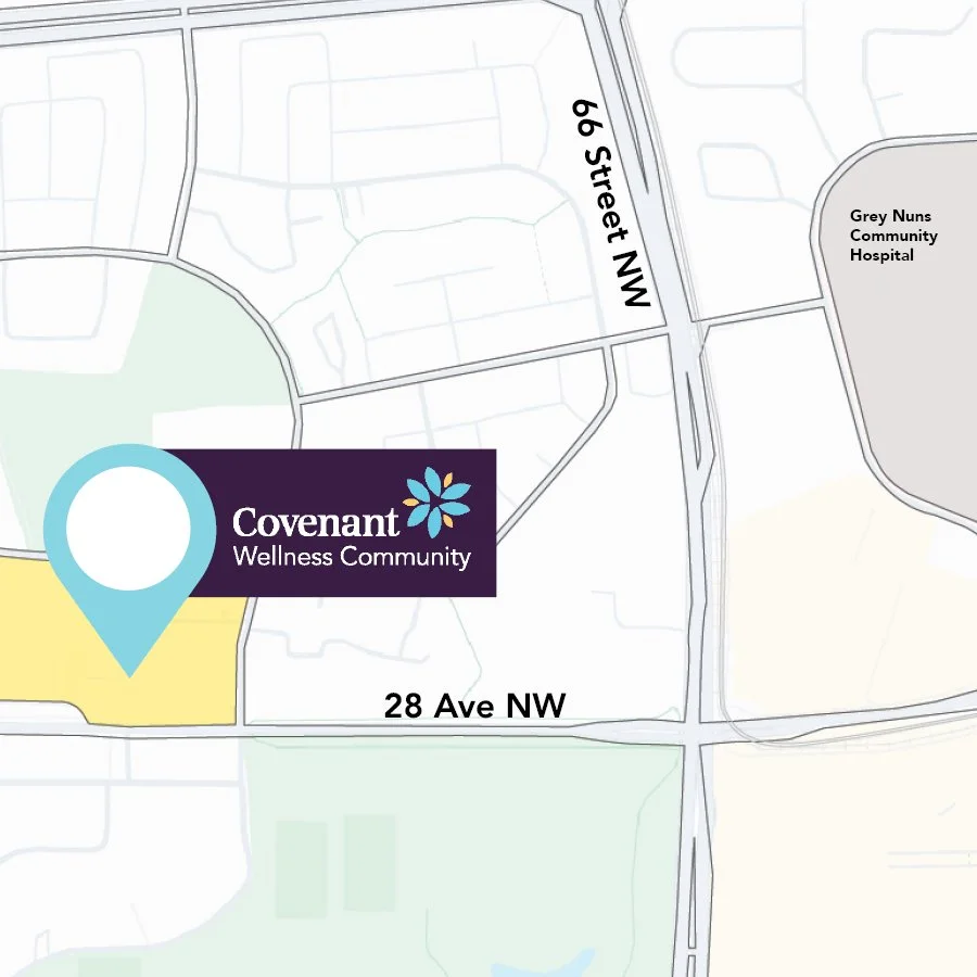 The Covenant Wellness Community is located at 28 Avenue NW and Lakewood Road East NW in Edmonton, Alberta.